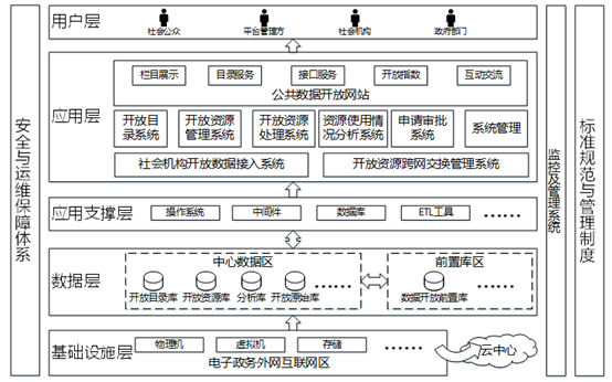 凯发K8国际公共数据开放平台总体上采用分层体系架构,由上至下分别为用户层、应用层、数据层、基础设施层,以及贯穿各层级的标准规范与管理制度、安全与运维保障体系。