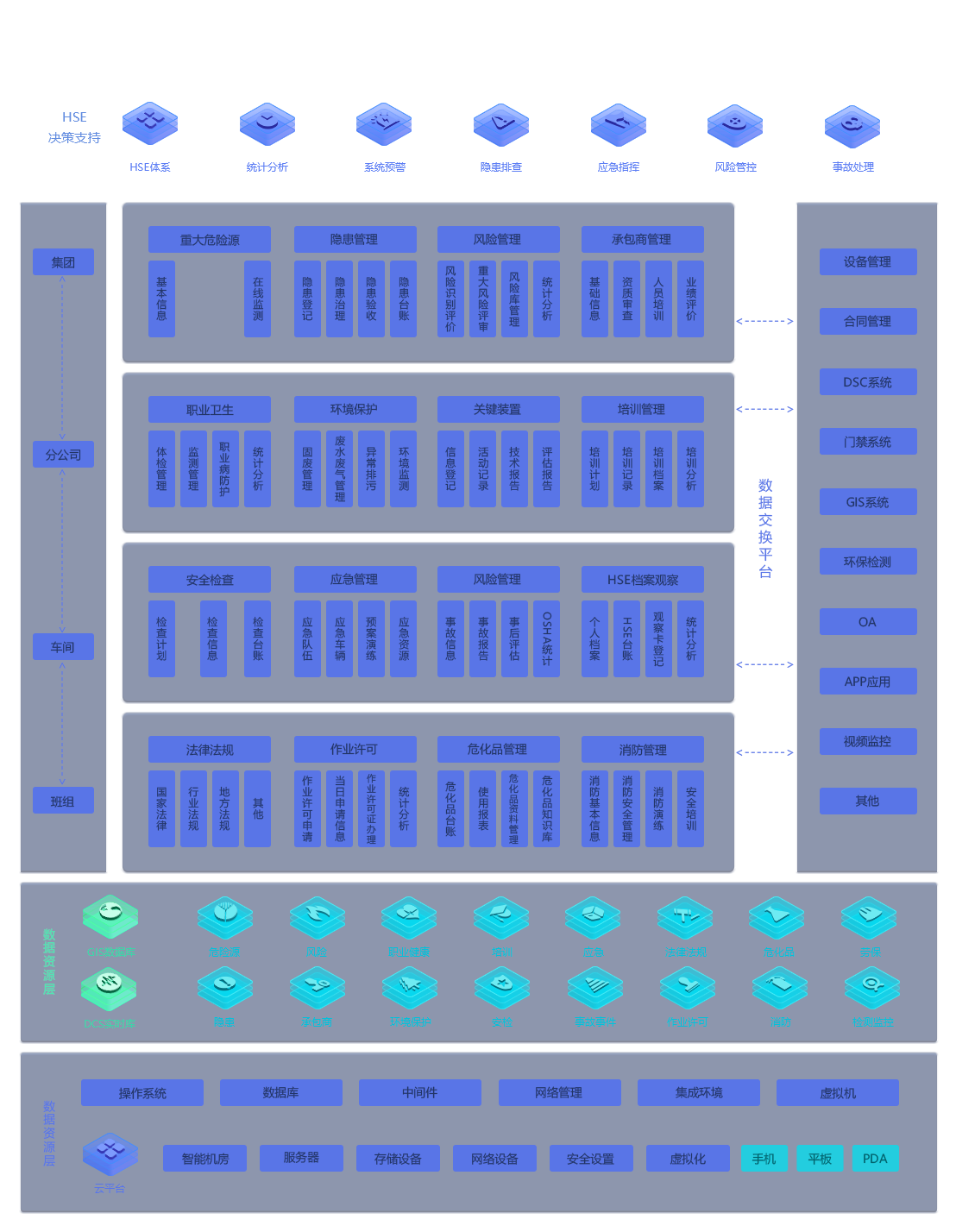 总部应用层:建立管理和健康安全环保体系,给予企业安全现状分析、隐患排查治理、企业信息监管、内部文件互动以及其他各项数据的统计分析和预警服务。