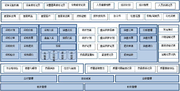 做到流程、记录、报表的统一,实现数据汇总分析,为企业给予准确、及时的记录数据支持。比如外部连接第三方三方仓库、物流平台,自动形成采购、销售、养护记录,提高效率。内部打通采购、库存、销售业务流程,实现业务统一及权限控制。