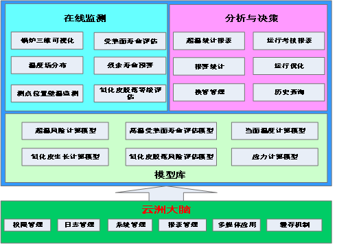 锅炉安全运行智能预警系统以云洲大脑为支撑,包括计算模型库、在线监测及决策分析等子系统,实现锅炉三维可视化、温度场分布、测点位置壁温监测、超温统计报表、报警统计、运行优化等功能
